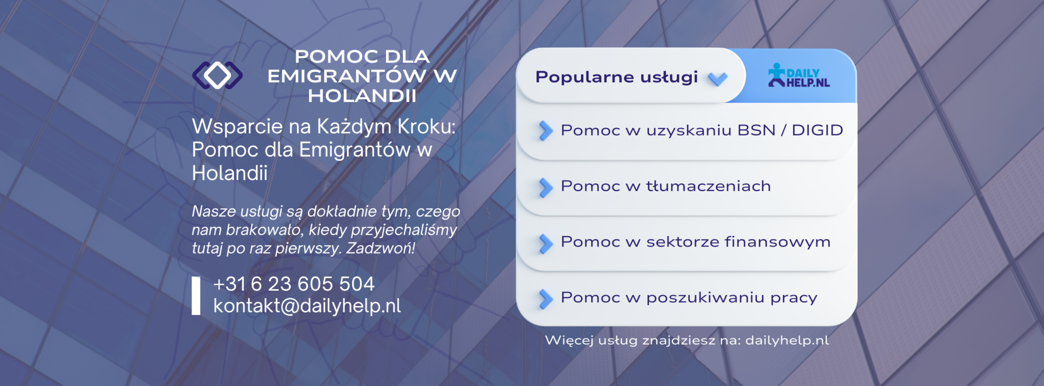 niesie wsparcie emigrantom w Holandii: m.in. sprawy administracyjne, finansowe, zdrowotne oraz te związane z pracą. Nasze usługi są dokładnie tym, czego nam samym brakowało, kiedy przyjechaliśmy tutaj po raz pierwszy. Służymy pomocą!